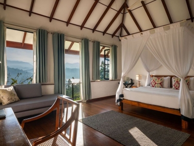 The Lakeview Bedroom features a four poster king size bed for gazing over the Castlereagh Valley, a wardrobe, armchair and sofa bed, desk, ceiling fan, and an ensuite bathroom with rain shower.